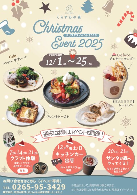 12月1日(月)〜25日(木)まで、くらすわの森各店舗で「クリスマス月間」を開催します。この時期だけの特別メニューやギフト、イベントをお楽しみください!