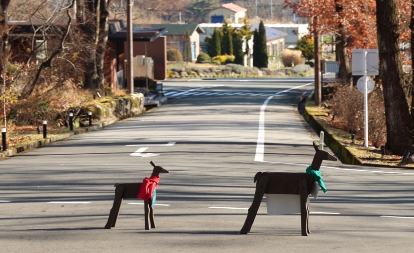 森の入り口で出迎えてくれるのは、親子(?)のシカさんたち。赤や緑のマフラーを巻いて、すっかりクリスマス仕様に変身中。なんだか嬉しそうに見えるのは気のせいでしょうか?