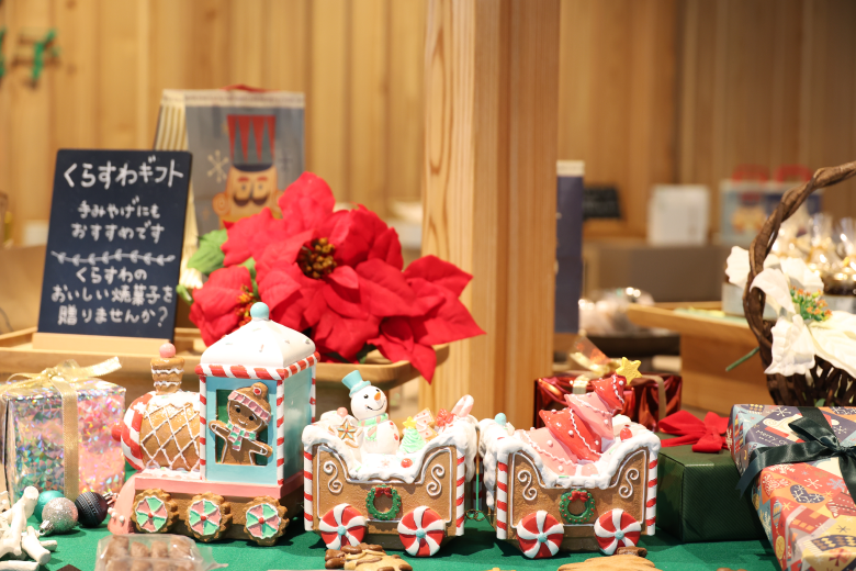 フォレストリングの中も、各店舗の雰囲気に合わせた装飾がいっぱいです。くらすわのお菓子コーナーの前には、クッキーでできた汽車のオブジェが登場。たくさんのお菓子を乗せて、見ているだけで楽しい気分になります。