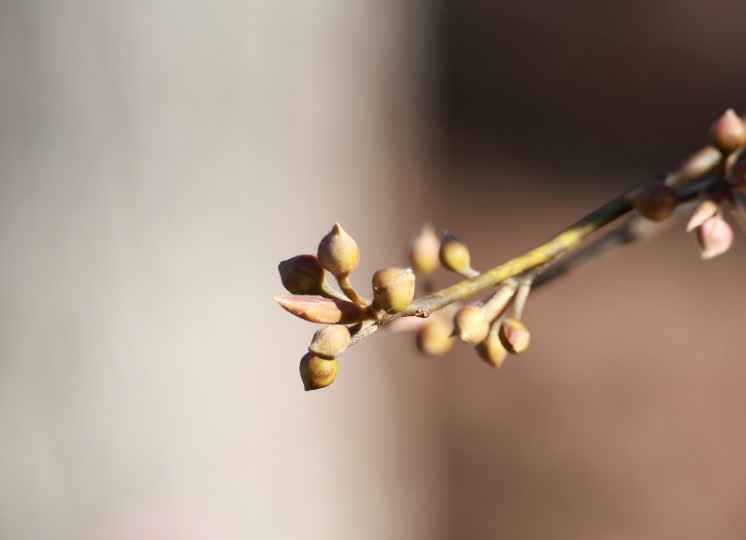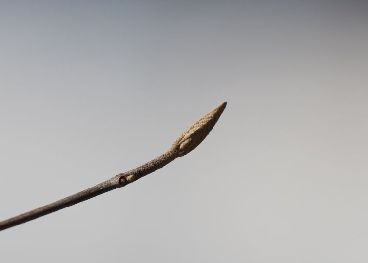 近くに生えていたムラサキシキブの冬芽は、うろこ状の皮に包まれない「裸芽(らが)」。小さな葉がむき出しになっている代わりに、表面に細かい毛が密生し、防寒の役割を果たしています。