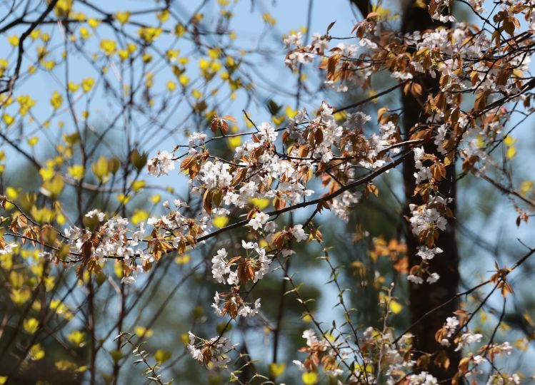 花と同時に赤みを帯びた若葉が展開するのが特徴で、葉色が花の淡いピンクをやさしく縁取ります。