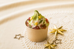 宇治抹茶の緑、いちごソースの赤、スター型チョコでクリスマスツリーをイメージ。