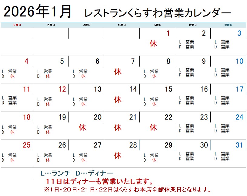 誠に勝手ながら、諏訪本店2階のレストランくらすわは、2026年1月の営業日を変更いたします。
