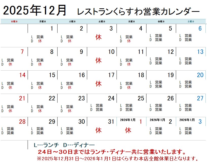 誠に勝手ながら、諏訪本店2階のレストランくらすわは、12月の営業日を変更いたします。