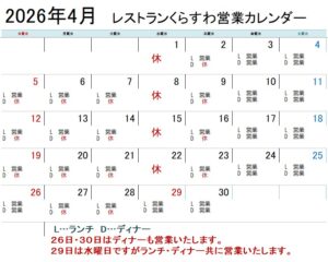 誠に勝手ながら、諏訪本店2階のレストランくらすわは、4月の営業日を変更いたします。