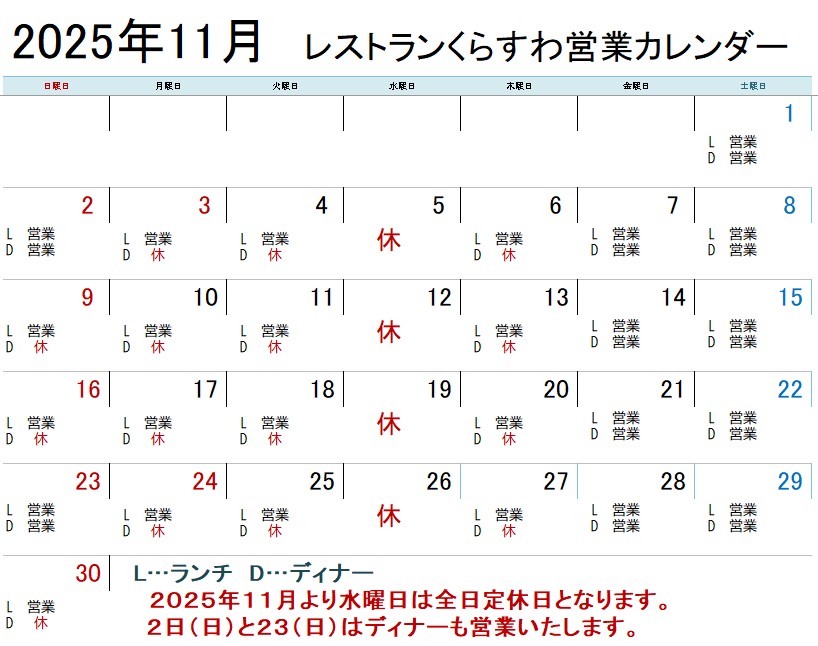 誠に勝手ながら、諏訪本店2階のレストランくらすわは、11月の営業日を変更いたします。