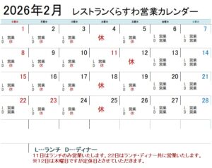 誠に勝手ながら、諏訪本店2階のレストランくらすわは、2026年2月の営業日を変更いたします。